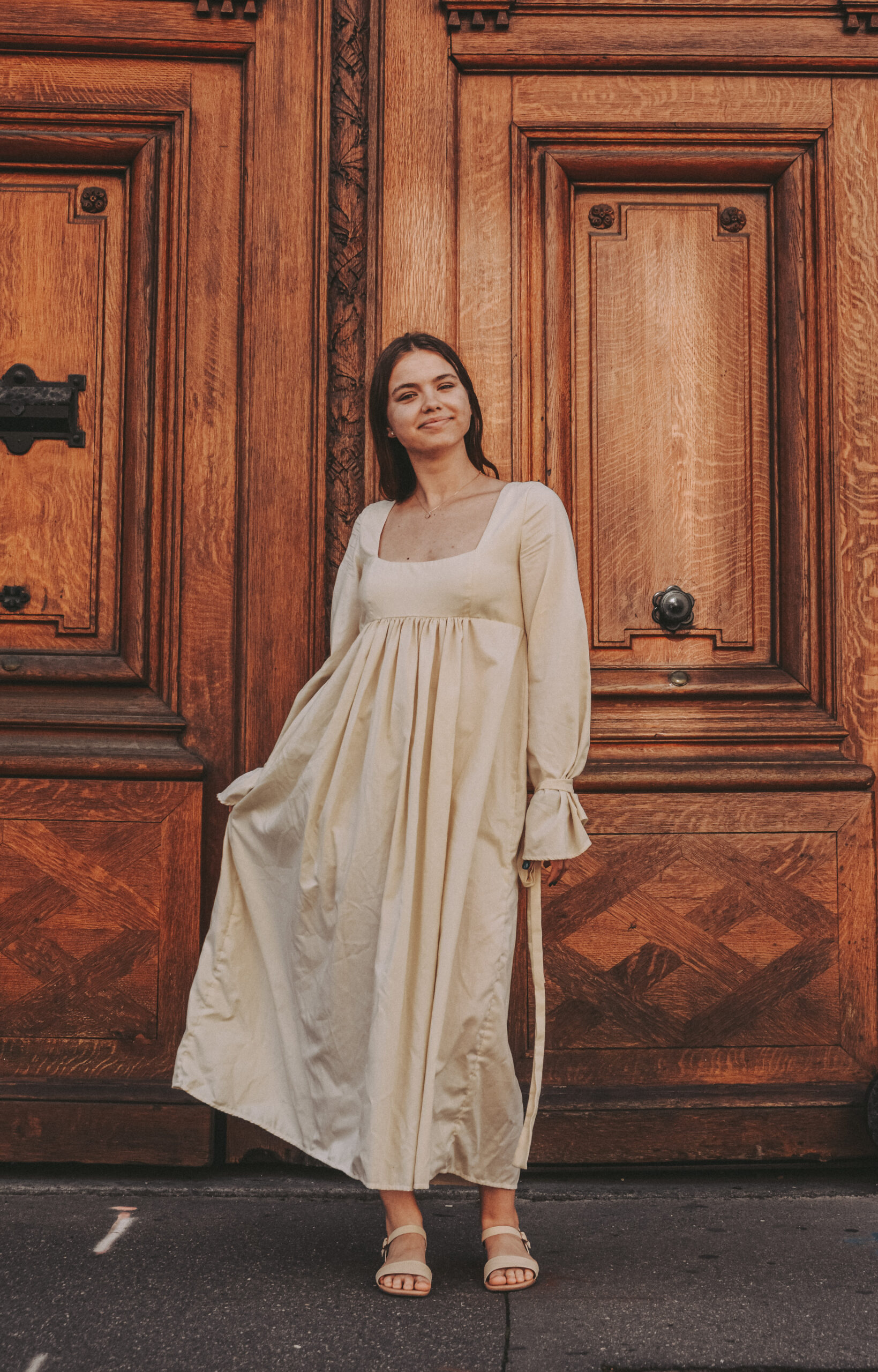 Dámske empírové šaty strihané vysoko pod prsiami – Šípová ruženka v štýle Empíru. Šaty majú podšitý živôtik.